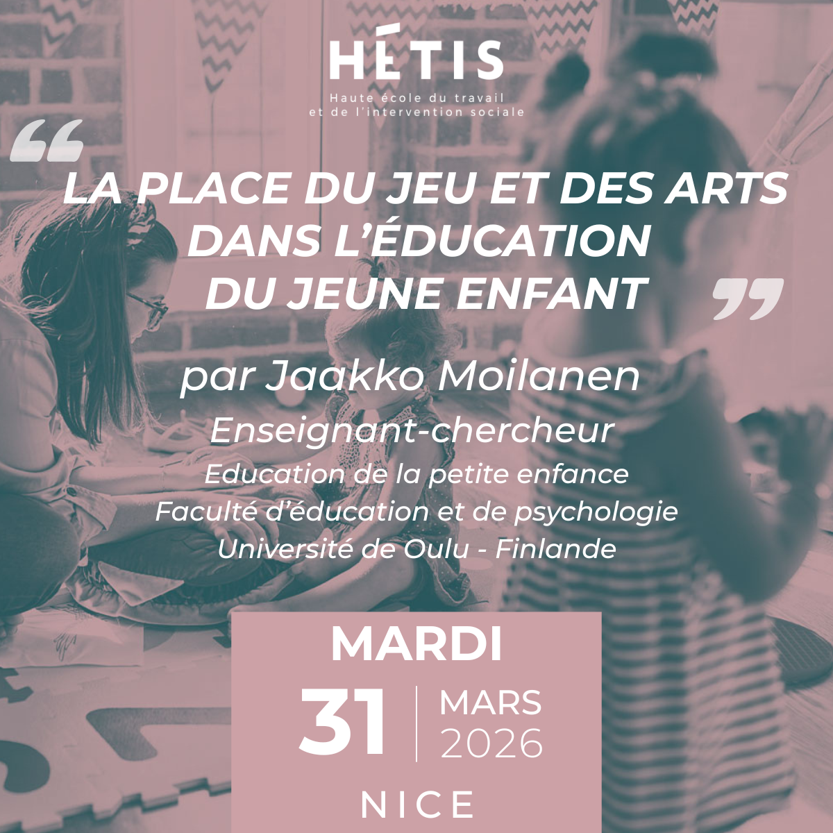 Dans le cadre d’une mobilité Erasmus+ et de son cycle de séminaires, HÉTIS organise à Nice une conférence consacrée à la place du jeu et des pratiques artistiques dans l’éducation du jeune enfant. Animée par Jaakko Moilanen, enseignant-chercheur à l’Université de Oulu en Finlande, cette rencontre s’adresse aux professionnels, aux étudiants et à toutes les personnes intéressées par les enjeux éducatifs de la petite enfance.